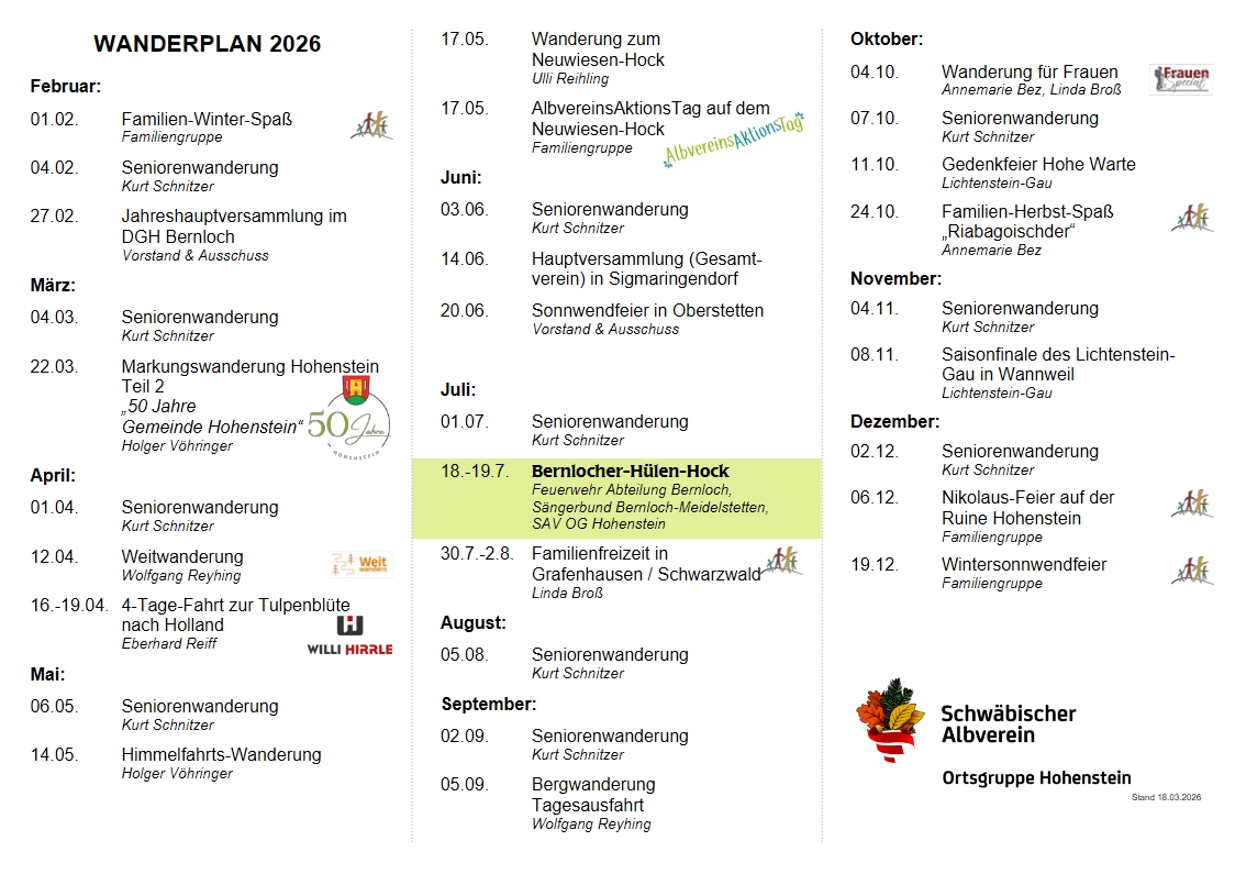 Beachtet auch unsere Veröffentlichungen im Amtsblatt der Gemeinde Hohenstein und hier unter Termine.
